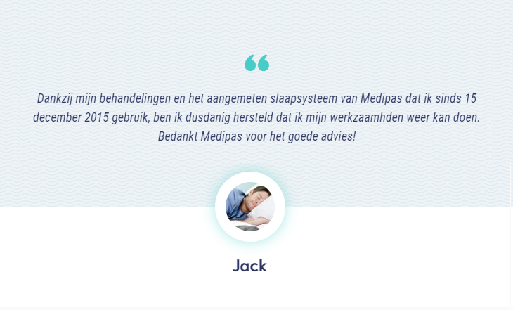 Omdat goed slapen niet voor iedereen vanzelfsprekend is, maar wij vinden dat dit het wel zo zou moeten zijn, hebben de experts van Medipas een slaaptest ontwikkeld. De Medipas slaapscan bestaat uit een korte vragenlijst, die ons inzage geeft in jouw problematiek. Eén van onze experts neemt vervolgens telefonisch contact op voor een gratis adviesgesprek op maat. Hierin bespreken we jouw persoonlijke situatie en leggen onze oplossingen voor.